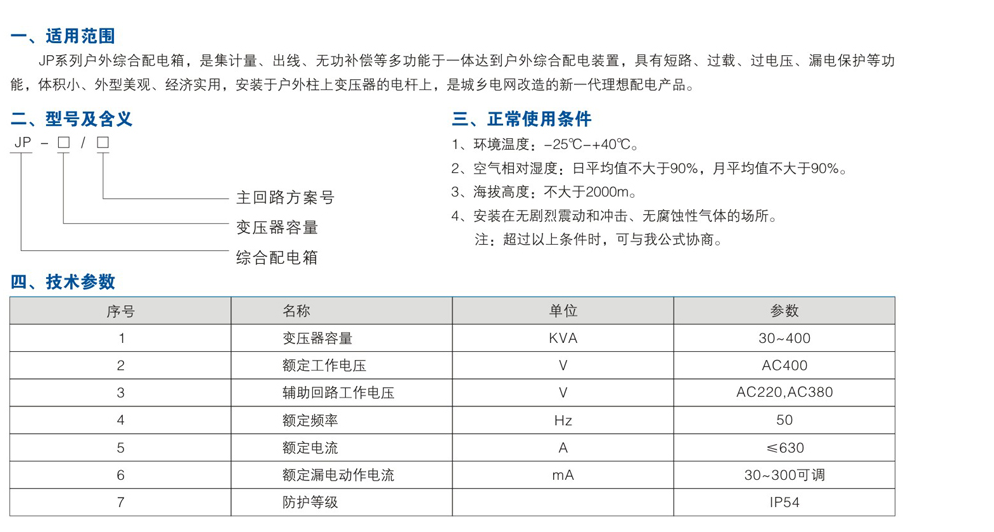 JP系列戶外低壓綜合配電箱是一種集電能分配、計量、保護、控制、無功補償于一體的新型綜合控制箱,是根據電網建設改造要求及電網運行經驗,本著安全、經濟、合理、可靠的原則而設計的,同時可根據用戶要求加入漏電保護功能。產品具有結構新穎、合理、防護等級高、安裝調試、維護及檢修方便等優點。是目前電網改造中理想的終端低壓成套裝置。
